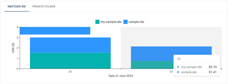 B. For a precise dollar amount, hover over a block, as shown in the right side of the image. Here, for example, on June 23, my-sample-ide-cost $0.74, and sample-ide cost $1.41.