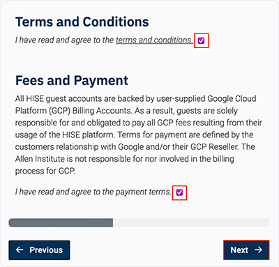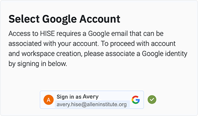 A workspace is a separate, fully provisioned computational space in which the steps of a CertPro can be re-executed in an environment that mimics the original tool stack. The workspace is built on GCP. If you're a HISE user, you have an institutional account that manages GCP billing and payment for you. If you're not a HISE or STRIDES user (see the accompanying box), any storage or compute costs you incur are charged directly to your GCP account. To establish a workspace, you must have a GCP billing ID. Follow the instructions below to create one and start your workspace.