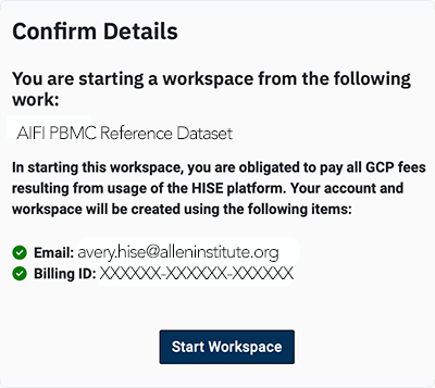4. On the Confirm Details screen, review your email address and the origin of the work (AIFI PBMC Reference Dataset in this example), and click Start Workspace.