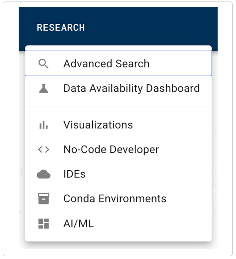 2. In the top navigation menu, click RESEARCH, and choose Advanced Search from the drop-down list.