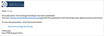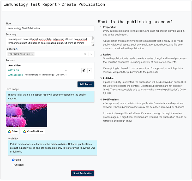 A publication consists of a report and supporting metadata, such as title, authors, and a hero image. In addition, you can provide visualizations, file sets, notebook files, or associated Github links. The publication is rendered as an HTML page in the HISE portal within a study.. This document explains how to create a publication, attach assets to it, request approval, and modify it after approval if necessary.