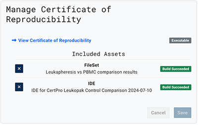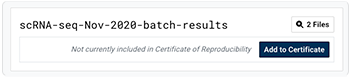 D. The selected file sets then appear on the screen (2 files, in this case). If the files are not already attached to the Certificate of Reproducibility, add them now by clicking Add to Certificate (recommended).