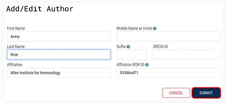 D. In the Add/Edit Author dialog box, enter the author's first name, last name, and other requested metadata, and then click SUBMIT.
