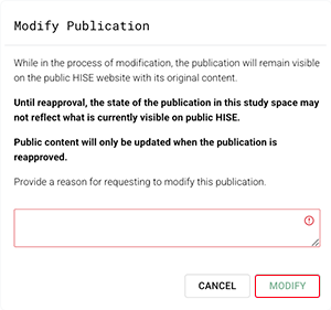 ii. In the Modify Publication dialog box, read the information, enter an explanation, and click MODIFY.