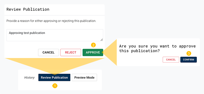 D. A dedicated publication reviewer reviews and approves or rejects the publication, as shown in the image. This step is shown for your information. There is nothing you need to do until the publication reviewer completes these steps. On approval, your publication is pushed to the public portal.