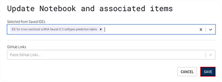 B. In the Update Notebook and associated items dialog box, in the Selected from Saved IDEs field, click the arrow to the right, and choose an IDE from the drop-down list. Repeat this step for each IDE you want to attach.
