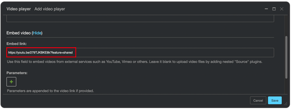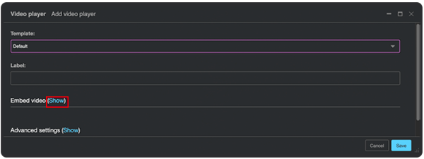 6. Return to your Data Apps page. In the Video player dialog box, to the right of the Embed video field, click Show.