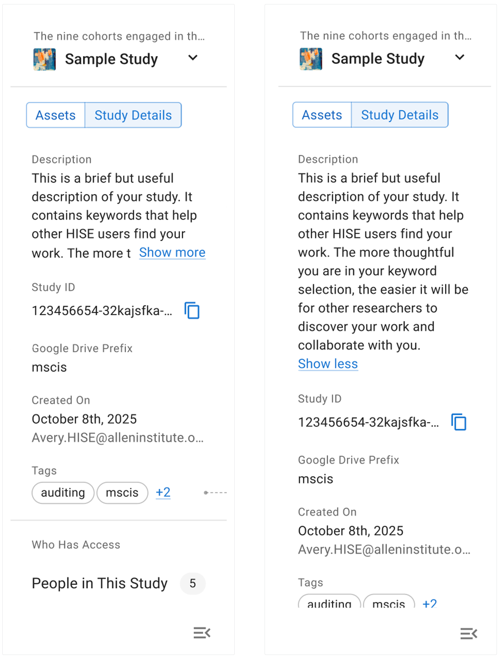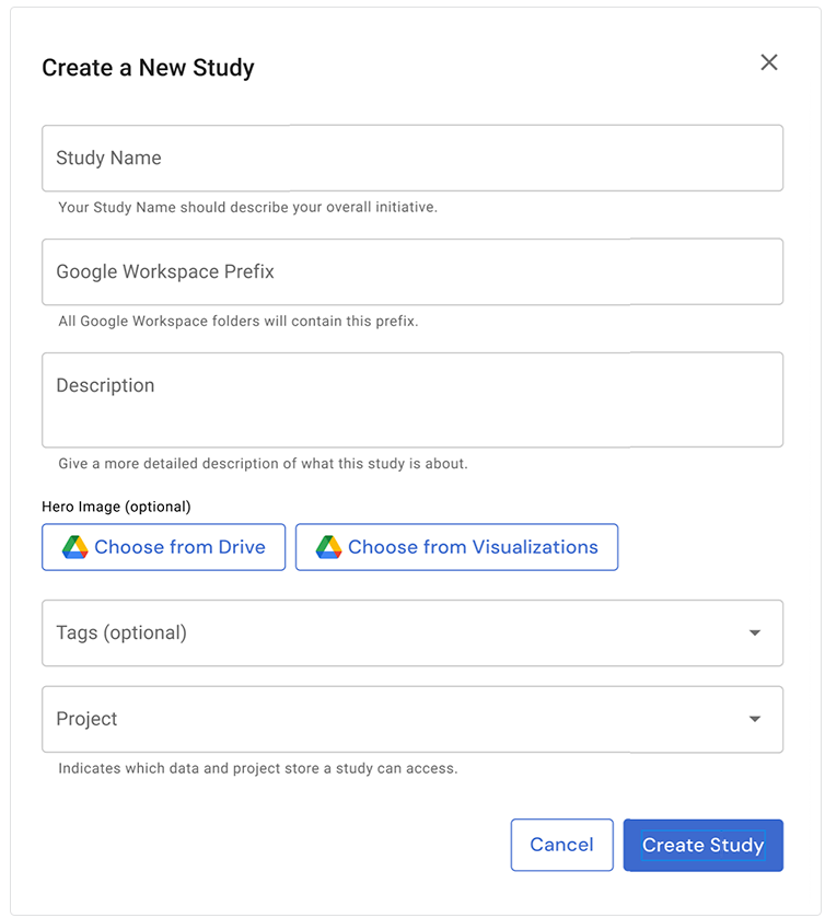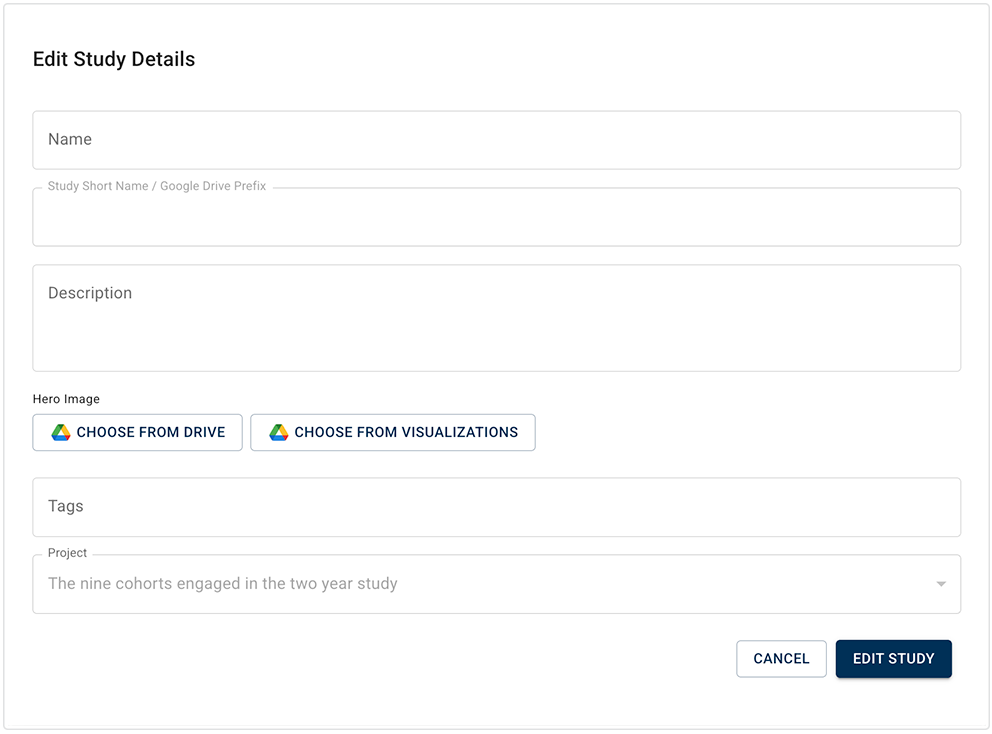 If you are a study owner, co-owner, or admin, you can update the study name, prefex, description, hero image, collaborators, or tags, or change the project with which the study is associated.