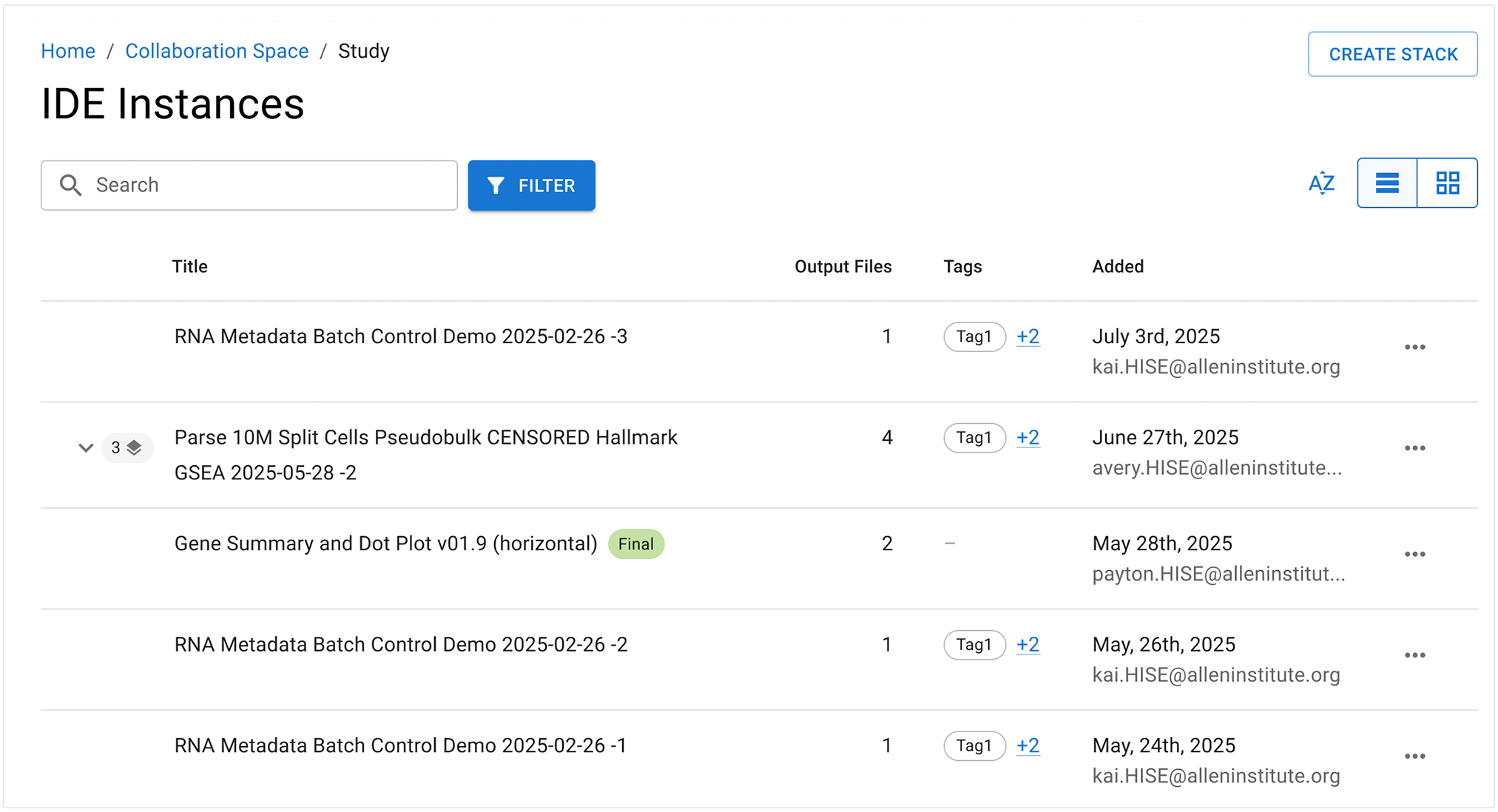 | IDE Instances | HISE's Jupyter Notebook environment lets you explore data and derive further insights using Python or R. You can upload the results to a study | ||||