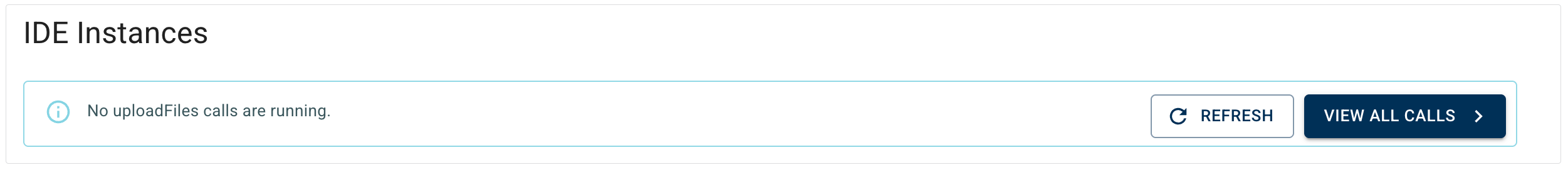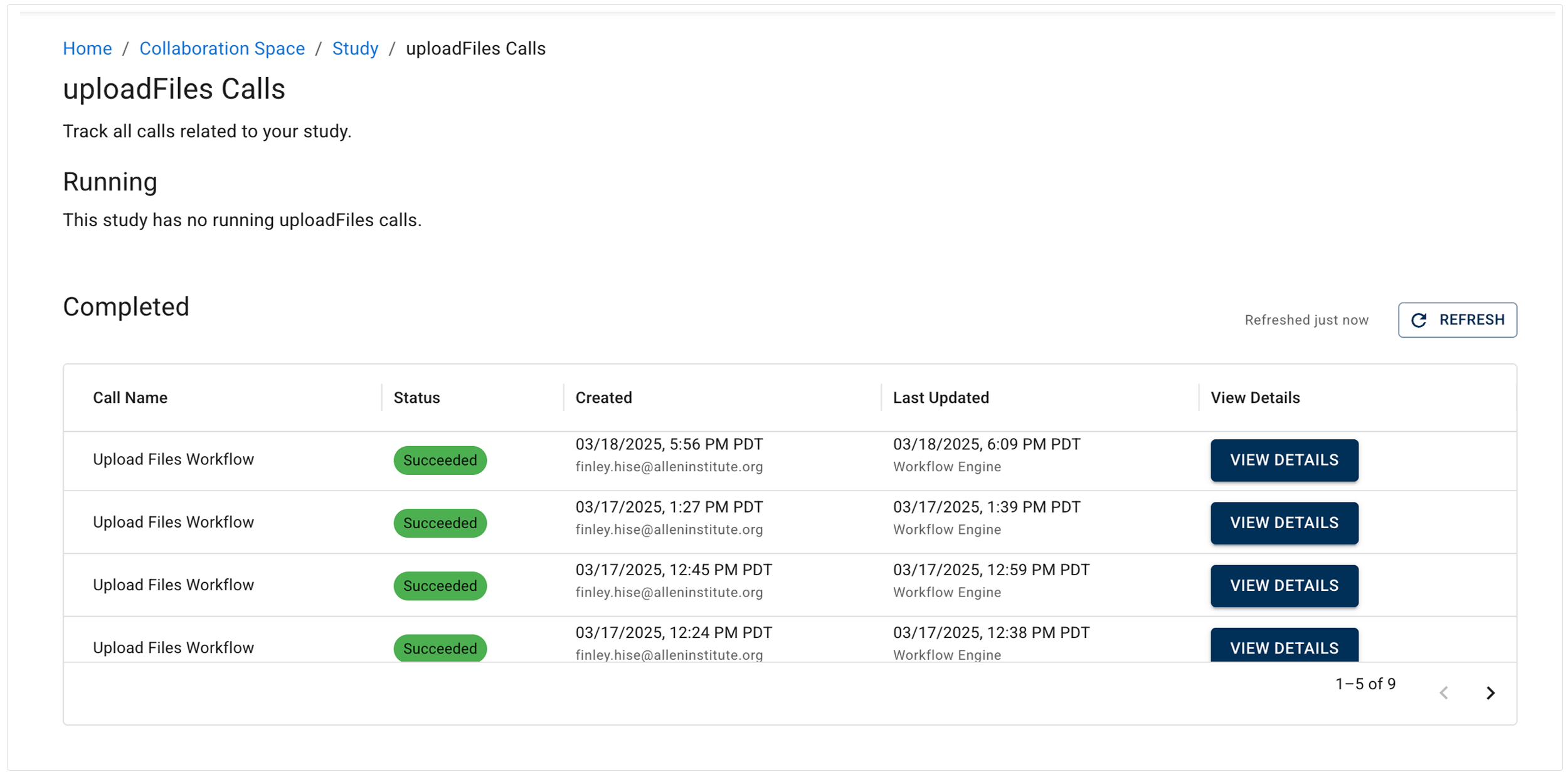 For detailed information on the status of your calls, the upload files workflow UI includes a banner, list view, and workflow details view. Together, these components describe the status of each upload files call for a given study. Get an overall snapshot of your calls, or drill down as far as you like on calls of particular interest.
