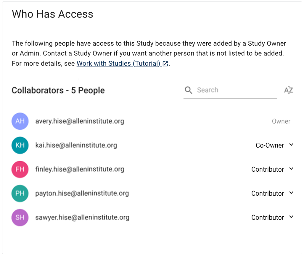 6. In the Who Has Access field, click Collaborators to view a list of users and their roles. For a description of each role, see the accompanying Role Definitions table. To edit collaborators or change role permissions, see the Add or change study access section of this document.