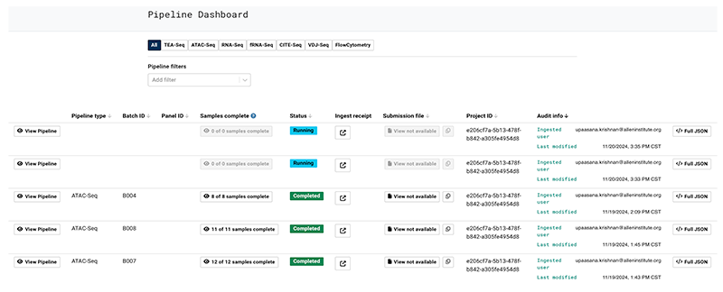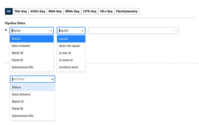 2. To filter by Pipeline type, Batch ID, Panel ID, Samples complete, Status, Ingest receipt, Submission file, Project ID, or Audit info, use the dashboard tabs.