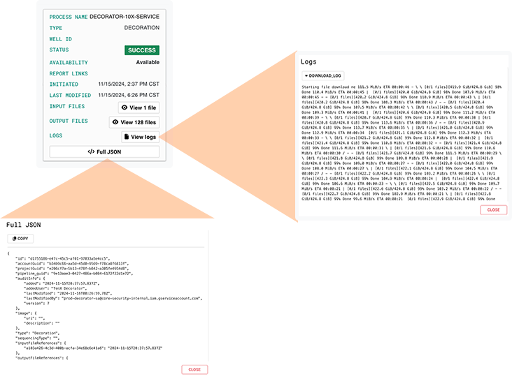 ii. Click to expand any node, and click View logs or </> Full JSON to see the complete logs or the entire block of JSON code, respectively.