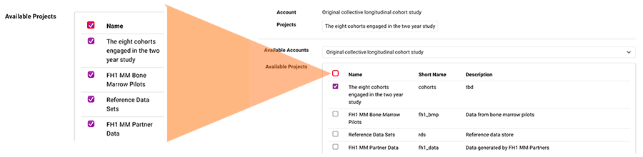 C. In the Available Projects field, select the account and project you want to use. To select or deselect all available projects, select or clear the checkbox to the left of the Name column.