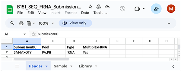 Inaccurate syntax can cause errors during pipeline runs. For details, see Use Correct Pipeline File Syntax (Tutorial). The submission sheet requires standardized syntax, especially in the Type column of the header sheet. Be sure to double-check the placement of spaces. A sample submission sheet is shown below.