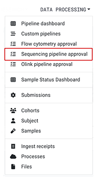 1. From the main navigation menu in HISE, go to Data Processing > Sequencing pipeline approval.