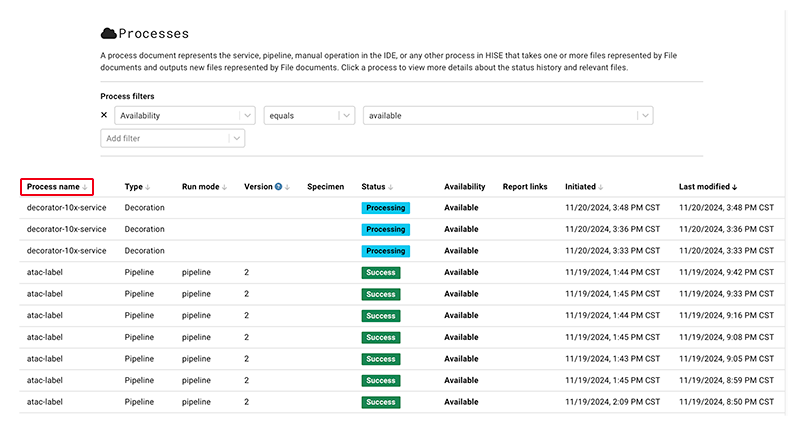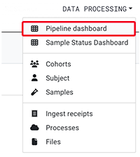 1. In the pipeline dashboard, you can view the status of each process in the pipeline run, find input/output files, and review error logs if problems occur. When a pipeline run is complete, or if a process fails, you're notified by email. To view the dashboard, go to the main navigation menu in HISE, and select Data Processing > Pipeline dashboard.