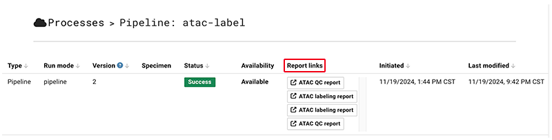 B. On the Processes > [Process name] page, in the Report links column, click the QC report for the process you want to view.