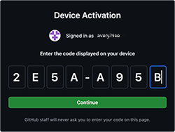 7. A one-time eight-digit GitHub activation code appears. (The code expires in 15 minutes, so now is not the time for a sushi run.) Click the link to open a browser window. If you get an error message, see the accompanying box.