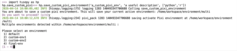 pixi.tomlincludes more than one Pixi environment option) HISE prompts you to choose which environment to save when you callhp.save_custom_pixi_environment(). Enter the number of the environment you want to use.
