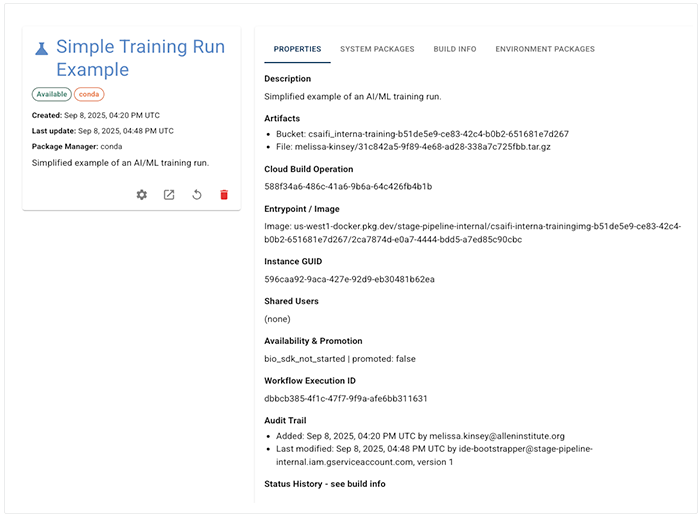 | PROPERTIES | Displays an overview of your environment, including its description, artifacts, Docker image, unique identifiers, and audit history. | Investigate environment setup, check reproducibility, and track when or how the environment was created or modified. | |||