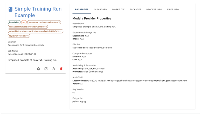 | PROPERTIES | Summarizes model, training run, and resource details, including entry point, status, and audit trail. | Confirm your experiment setup and troubleshoot issues related to training configuration. | |||