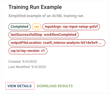 1. To watch your job start, view logs, iterate on your script, and track progress, go to RESEARCH > AI/ML > Training Runs, and click View Details. To see the most recent runs, sort by date. For details, see Review an AI/ML Training Run (Tutorial).