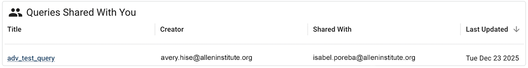 | Queries Shared With You | Shared with specified collaborators | Saved queries visible to the specified set of users or groups. Those collaborators can see and run the query. They might also edit or manage it, depending on their permissions, but the query is hidden from everyone else on the account. | |
