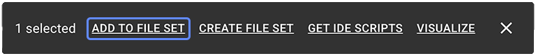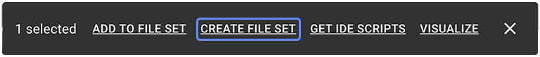 | CREATE FILE SET | Pop-up options menu | Creates a new file set from the currently selected items. | Lower-right corner of results window | |