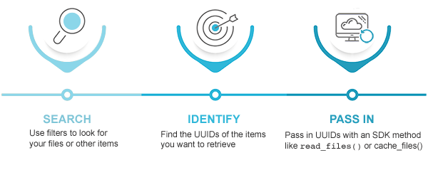 When you have the results you want, you can move them into other parts of HISE. For example, you can save them within specific studies, create new file sets, or launch visualizations for exploratory analysis. Another option is to use an SDK method in R or Python to read or cache the files from an advanced search into your IDE. The typical pattern is shown in the accompanying image. For reproducibility, treat the saved queries themselves as research assets that document how a particular cohort or dataset was defined.