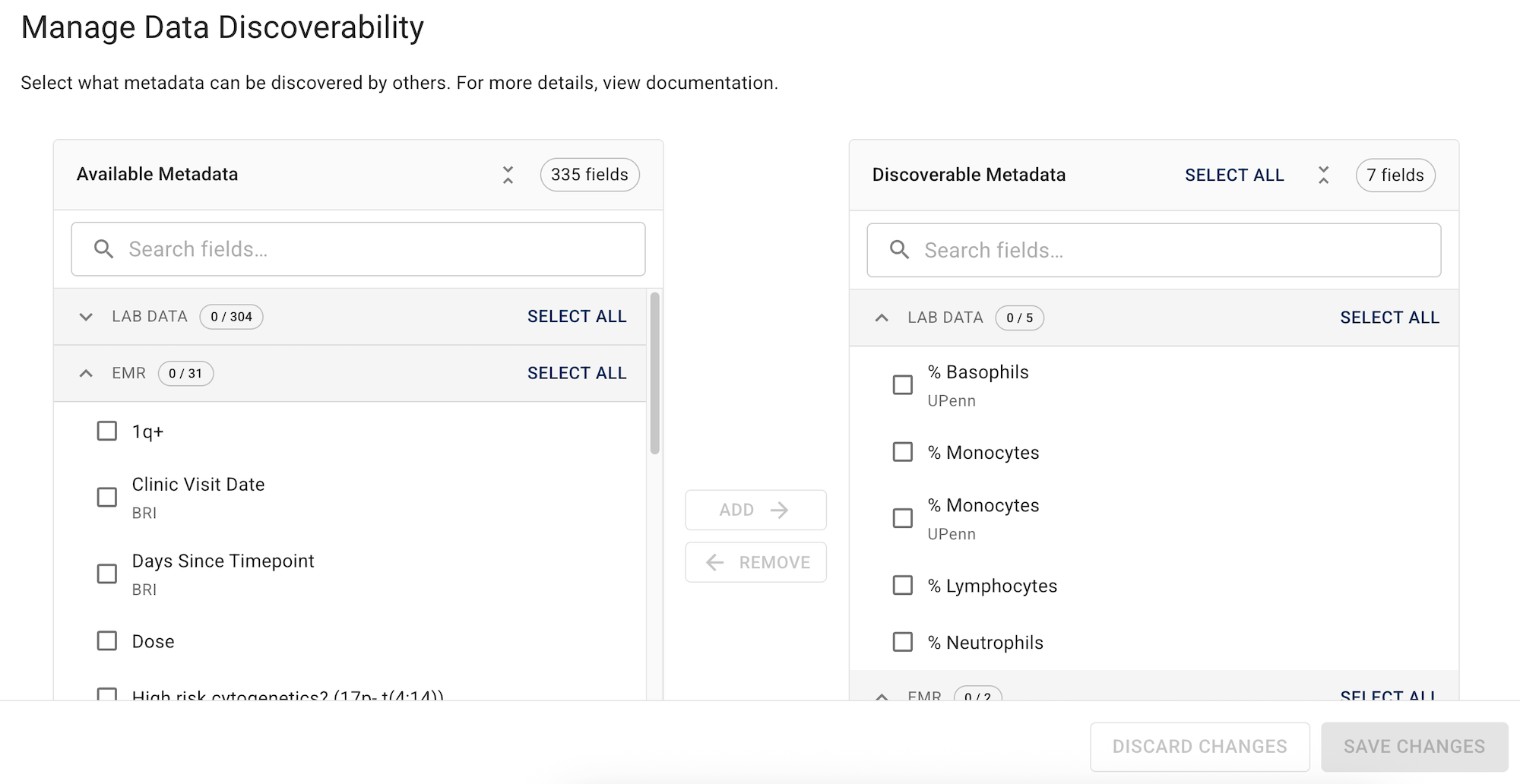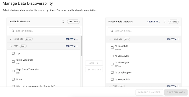 By default, human metadata (lab results, EMR data, and survey responses) is excluded from all publicly accessible Data Apps and publications. HISE has new data discoverability features that let you explicitly choose which fields to include in the public data that becomes findable in Advanced Search.