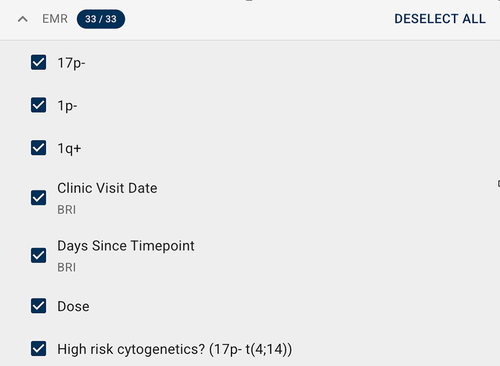 B. Scroll through the list of fields under each Available Metadata group. These categories—LAB DATA, EMR, and SURVEY DATA—correspond to the Advanced Search filters. To see the fields in each collapsible group, click the arrow (the expand icon) next to the group name.