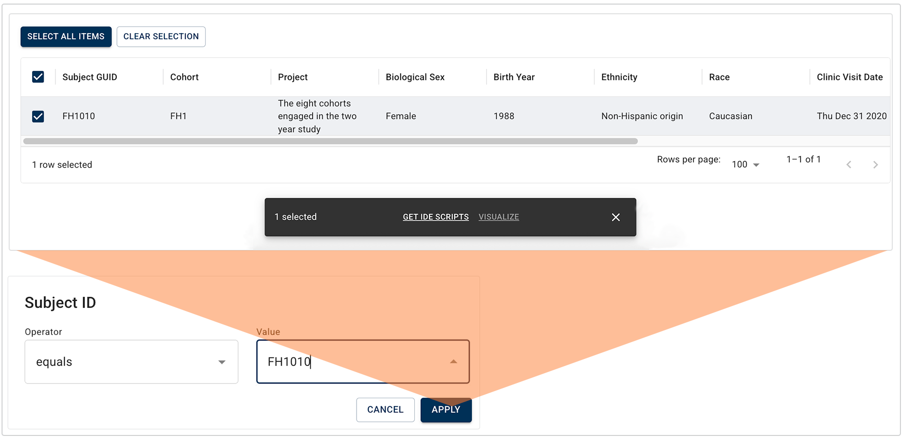 i. Here we chose Subject ID from the Subject Metadata filter group. (For a complete list of filters and instructions on using them, see Use Advanced Filters for Complex Search Queries (Tutorial).)