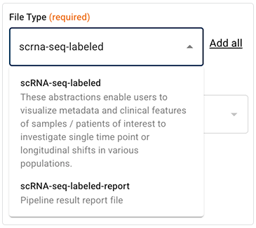 | Many file types, such as the scRNA-seq file types shown here, are annotated with general descriptions of the file content or format. If you're not sure which file type you want in your search results, use these descriptions to help you decide.