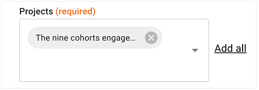 A. In the Projects field, click the arrow to open the drop-down list, and select one or more projects. Alternatively, to select all available projects, click Add all.