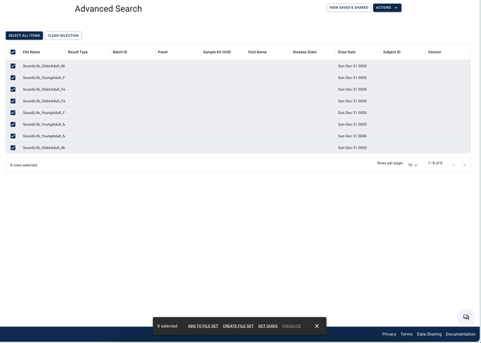 Advanced Search lets you define the subjects, file types, or studies you want to find in HISE. With this powerful feature, you can create queries and filter result files by file, sample, EMR metadata, or public files. You can use your results to create a new file set, add to an existing set, send the data to an IDE for further inspection, or (in some cases) visualize your results. This document explains how to create, save, and share basic queries, as well as how to use your search results.