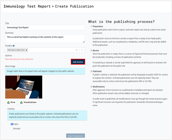 8. Proceed to Step 4 in the next section, Add an author to a Data App. From that point on, the instructions to add an author to a publication or a Data App are identical.
