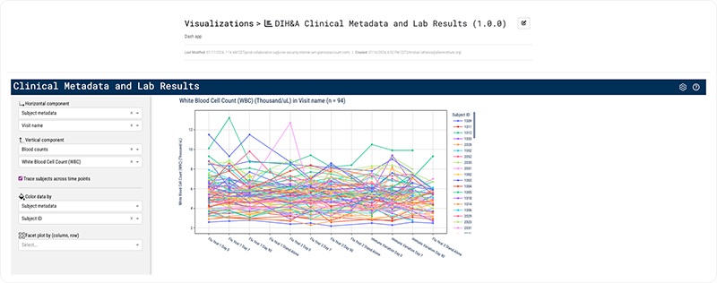 | Flow cytometry data | Derived from a technique in which a laser is used to detect and measure physical and chemical characteristics of a population of cells or particles | In a per sample and per panel visualization, you can select cell subsets, removing the unselected cells from view. In addition, you can select results of the same type (including panel) of multiple samples and compare the results side by side. You can segment the data in multiple ways, such as by subject demographics, sample metadata, or CBC data, depending on the nature of your samples. |