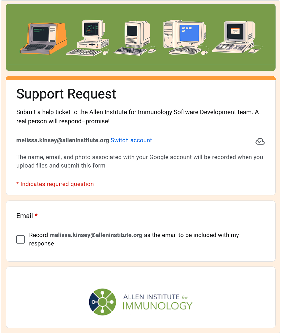 In the upper-right corner of each user documentation page (support.allenimmunology.org), including this one, is a Support button. This button opens a Google Form that automatically populates a Jira ticket and sends it to the entire dev team (immunology-support@alleninstitute.org). One of the developers will reply during normal business hours.